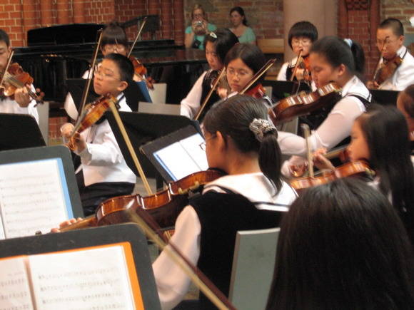 深圳市少年宫弦乐团演奏了包括《吉祥如意》、《良宵》和《蓝色多瑙河》等十一首中外著名乐曲,赢得观众阵阵热烈掌声。两次谢幕都被观众如雷的掌声留在台上,最后,乐团不得不再次演绎了《第五号匈牙利舞曲》和《如歌的行板》两首曲子。