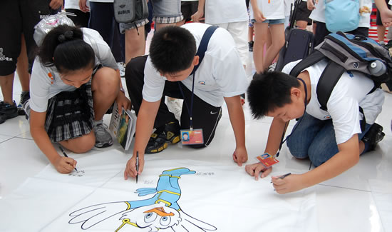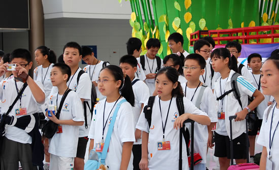 7月26日上午7时,由49人组成的艺术交流团在少年宫水晶大厅正整装待发。临行前的孩子们显得异常地兴奋,他们相互攀谈,互通信息,展示着他们由衷的那份喜悦,并结伴在旗帜上签名留念。