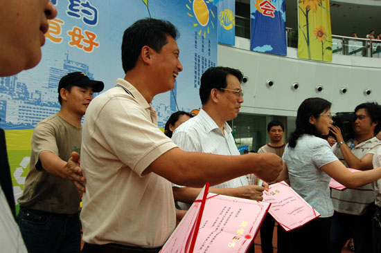 领导给环保文艺表演大赛的获奖者颁奖