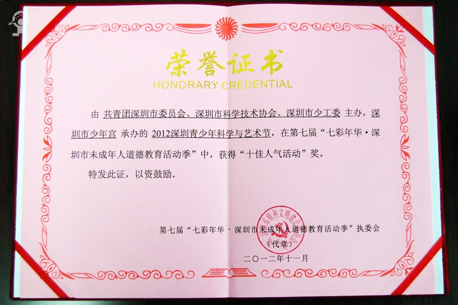 由团市委、市科协、市少工委主办,市少年宫承办的“2012深圳青少年科学与艺术节”活动已于9月圆满落幕。近日,在第七届“七彩年华•深圳市未成年人道德教育活动季”十佳活动项目评选中,该活动项目从活动季365个项目中脱颖而出,喜获“十佳人气活动”奖。
