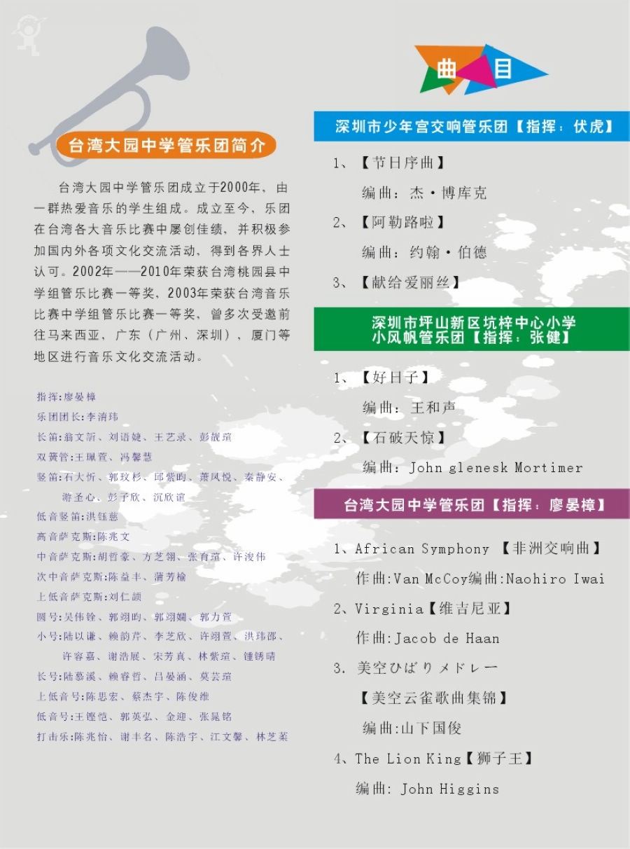 由团市委、市科协、市少工委联合主办,市少年宫承办的 “2014深圳青少年科学与艺术节”活动自六一节期间启动以来,已连续推出了各类青少年公益活动近20项,深受广大青少年欢迎。暑期将至,“科艺节”又为青少年朋友们准备了一场公益艺术大餐——“管鸣乐韵两岸情”深台青少年管乐交流音乐会将于7月8日晚20:00在少年宫剧场隆重上演。此次演出由来自深圳与台湾的3支青少年管乐团队联袂奉献。