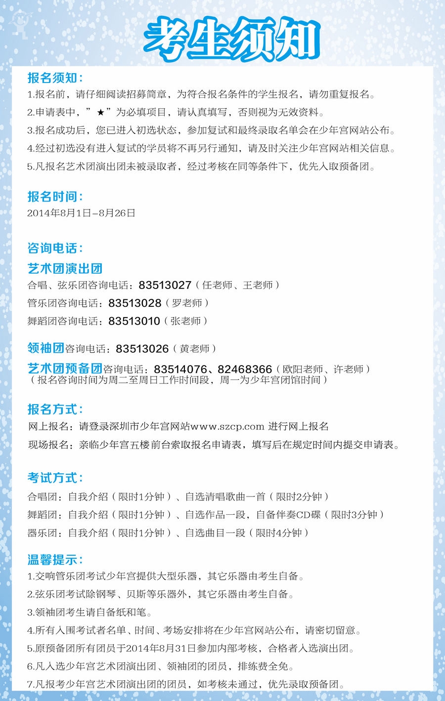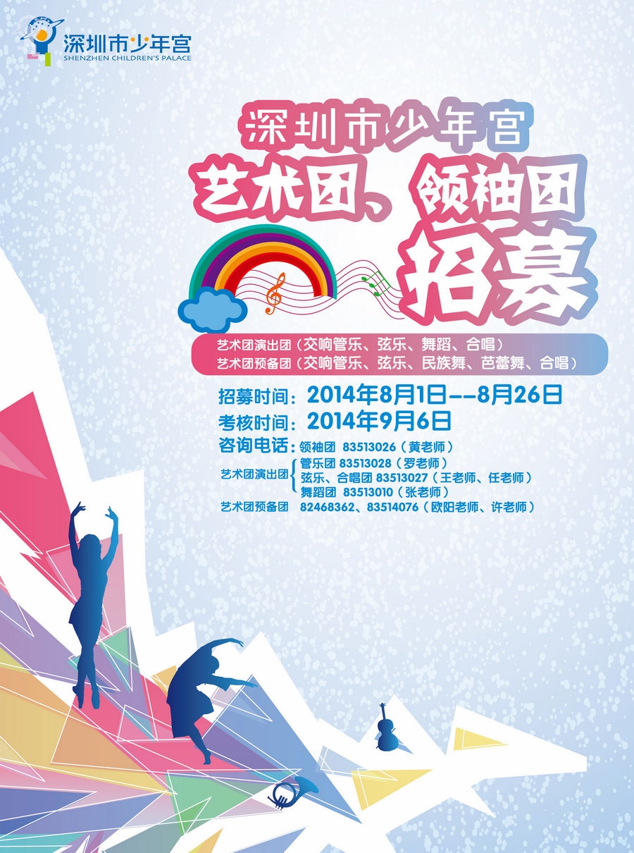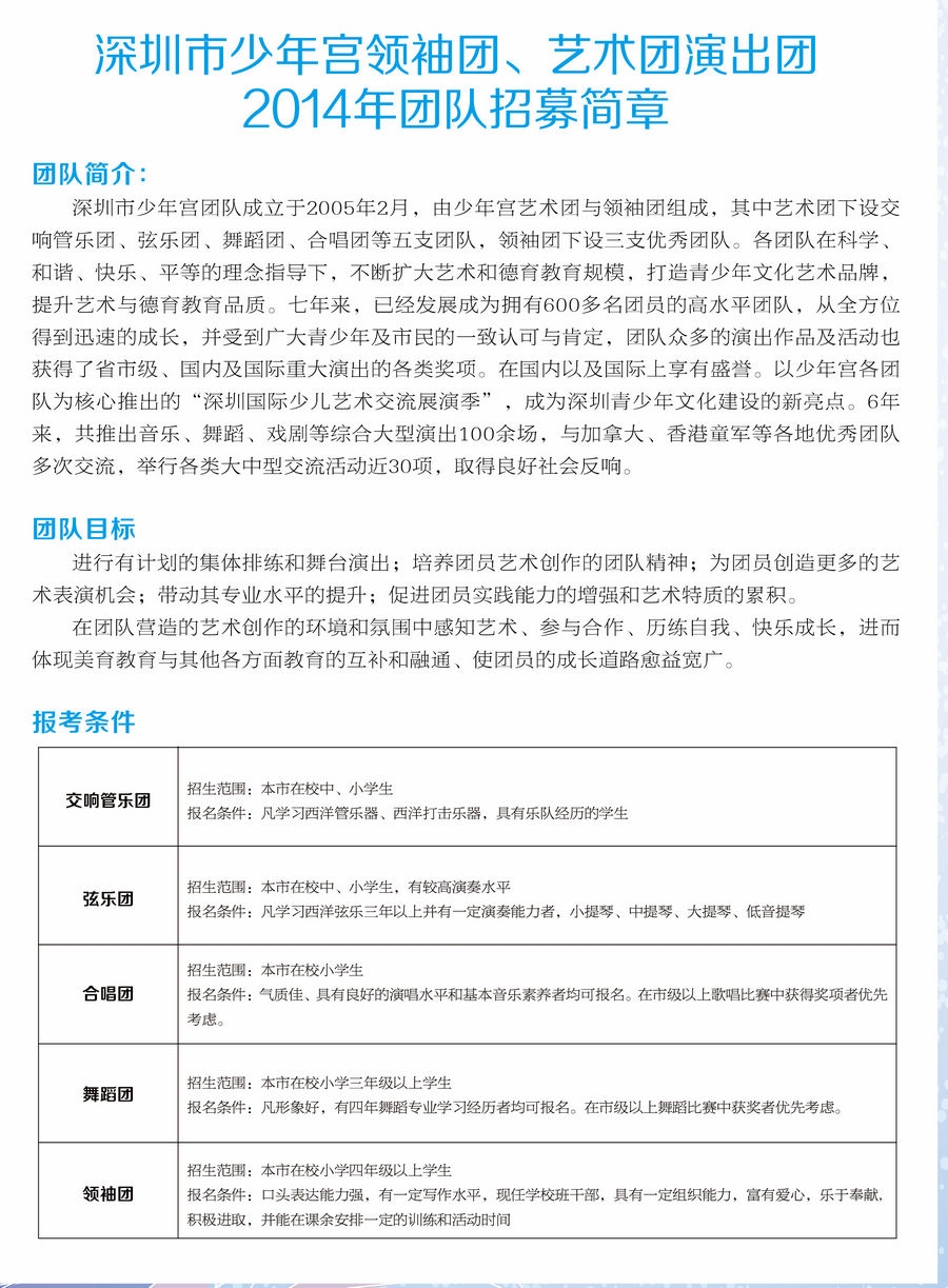 一年一度的深圳市少年宫艺术团和领袖团的秋季团员招募工作将于8月1日正式启动,报名时间为8月1日——8月26日,考试时间安排在9月6日。少年宫团队致力培养和挖掘全市高素质、高水平、有特长的少儿艺术人才,为他们提供一个展示艺术及才华的舞台,凡有艺术特长或领袖才能的中小学生,均可登录少年宫网站www.szcp.com或前往少年宫现场报名,凡入选成为艺术团演出团和领袖团团员者,一律免费参加、排练和演出,并有机会代表深圳市参加国内外的演出、交流及重大比赛活动。