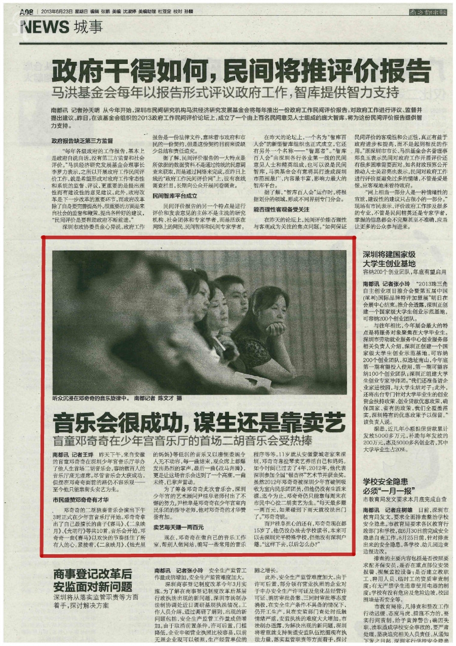 南都讯记者王烨 昨天下午,来自安徽的盲童邓奇奇在深圳少年宫音乐厅举办了他人生首场二胡音乐会,容纳数百人的音乐厅座无虚席。尽管音乐会大获成功,但摆在邓奇奇面前的路仍不容乐观———至今他只能靠街头卖艺为生。