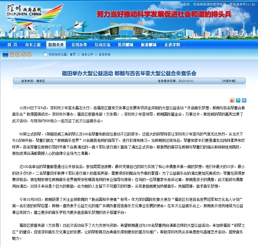 〖深圳政府在线〗福田举办大型公益活动 郎朗与百名琴童大型公益合奏音乐会