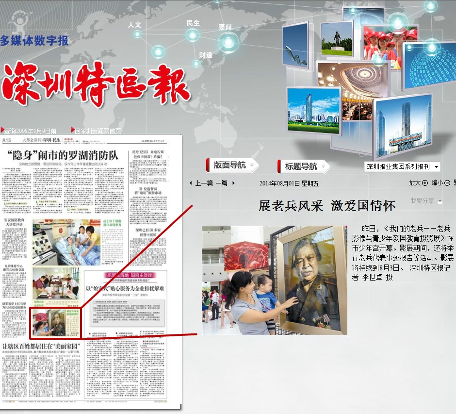 〖深圳特区报〗展老兵风采 激爱国情怀 2014年08月01日 作者:李世卓 来源:深圳特区报 昨日,《我们的老兵——老兵影像与青少年爱国教育摄影展》在市少年宫开幕。影展期间,还将举行老兵代表事迹报告等活动。影展将持续到8月3日。 深圳特区报记者 李世卓 摄