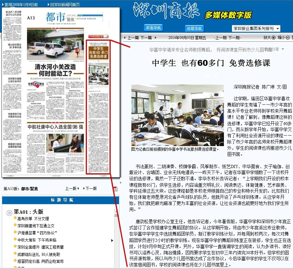 这学期,福田区华富中学喜欢舞蹈的学生有福了——市少年宫的高水平专业老师将到学校来开舞蹈课!记者了解到,像舞蹈课这样的选修课,华富中学已经开设了60多门,而从新学年开始,华富中学又有了利用社会资源开设的课程——除了市少年宫的名师来校开舞蹈课外,学生的阅读课也将搬进市少儿图书馆。