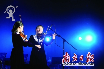 1日晚,深圳市少年宫连续第五年举办新年文艺晚会(音乐会)。图为范欣叶和罗慧盈合作维尔瓦第a小调双小提琴协奏曲。朱洪波 摄