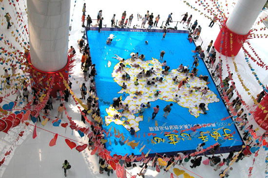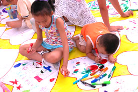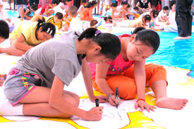 今天是10月1日国庆节,“手拉手心连心”2005两岸四地少儿美术创意联展在深圳市少年宫隆重开幕。在少年宫展出的5000余件来自深圳、香港、澳门、台湾少年儿童的绘画、雕塑、陶艺和创意手工作品,吸引了众多家长和孩子前来参观。活动首日,共有深、港、澳、台的数百名少年儿童在一幅巨大的中国地图上共同创作画卷,表达美好祝愿。