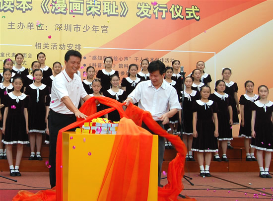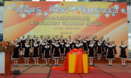 这个六一儿童节,少年宫特为全市小朋友准备了一份丰盛的大礼—— 深圳原创青少年漫画读本《漫画荣耻》。今年三月,胡锦涛总书记围绕树立社会主义荣辱观,明确提出了“八个为荣,八个为耻”的讲话,随后,少年宫集合全市众多优秀少儿社会教育专家、动漫策划制作人及绘画艺术家,成立了《漫画荣耻》连环漫画创作组。创作组采用活泼健康,易于少儿理解和观赏的连环画形式,以深圳少年日常生活中的所见所闻为素材,经过两个多月日以继夜的努力,终于在儿童节前创作出《漫画荣耻》一书,免费向全市儿童派发。该书通过一幅幅直观、形象的漫画,一个个生动、活泼的事例,使“八荣八耻”的精髓得到极好的展现和宣扬,让少年儿童们在舒畅愉快的阅读体验中理解并掌握“八荣八耻”,成为了献给全市少年儿童最珍贵最有意义的节日礼物。