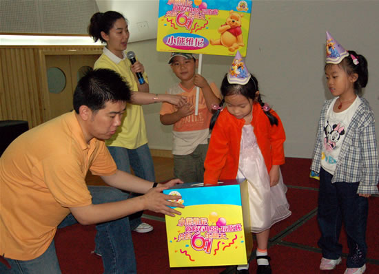 这个六一,少年宫还为小朋友们精心准备了两场免费的迪士尼电影观摩和有奖游艺活动。今天下午,在少年宫三楼的音乐厅,一场深受小朋友喜爱的迪士尼电影《小熊维尼:感恩的季节》刚刚在这里放映结束。随即,记者看到被分为六组头戴各式不同卡通帽的小朋友们分别扮演着小熊维尼、跳跳虎、小猪、屹耳、瑞比、小豆等深受小朋友喜爱的迪士尼卡通人物,开始了紧张激烈的比赛。主持人在六组中各抽出三名小朋友上台回答问题,答题数量最多的组即被宣告获胜。接着,主持人更让小朋友们模仿动物的表情,如“小猪害羞了”“跳跳虎生气了”,小朋友们滑稽可爱、维妙维肖的模仿令人忍俊不禁,逗得在座的观众哈哈直乐。胜出的小朋友赢得了奖品,所有参与的小朋友也都欢欢喜喜地领到了迪士尼大礼包一个。
