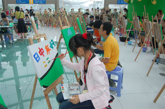 记者首先看到的是一个韩国女生在画板的左上方写下“韩国”的英文字样,然后又在右下方写下“中国”的英文字样。接着,她在“韩国”字样的左上方画上韩国国徽,在“中国”字样的右下方画上中国国徽。之后,她用二个下弯线条和一条上弯线条画出一张笑脸,并用英文写下“我们是朋友”。一幅充满童趣色彩斑斓的作品就完成了。