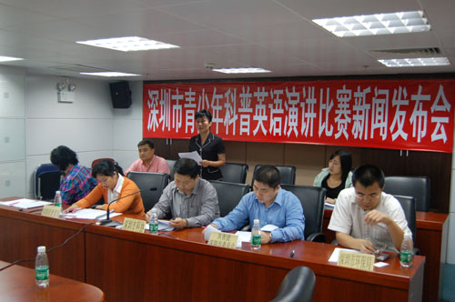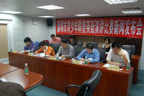 深圳市青少年科普英语演讲比赛新闻发布会于昨日在市青少年宫举行,市科协、团市委、市教育局、市环保局的领导以及大赛相关主办人员参加了此次发布会。在会上,主办方向记者们介绍了此次大赛的重要意义及流程,并回答了与会记者的提问。