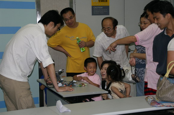 今天是五一黄金周的首日,一大清早,记者看到许多家长带着小孩来到少年宫,在二楼的科技展馆,参加由百名科普志愿者组织的科普游园活动。不到10点,整个活动现场就已经是人潮涌涌、场面热烈。现场活动项目非常多,有大自然科技实验活动,有智能机器人快乐活动讲座,有青少年健康上网现场指导,还有适合低幼儿的“完整儿童”益智游戏。所有的活动,家长都可以和孩子们一起参与,在“玩”中学习科学知识,在“玩”中构建和谐家庭。