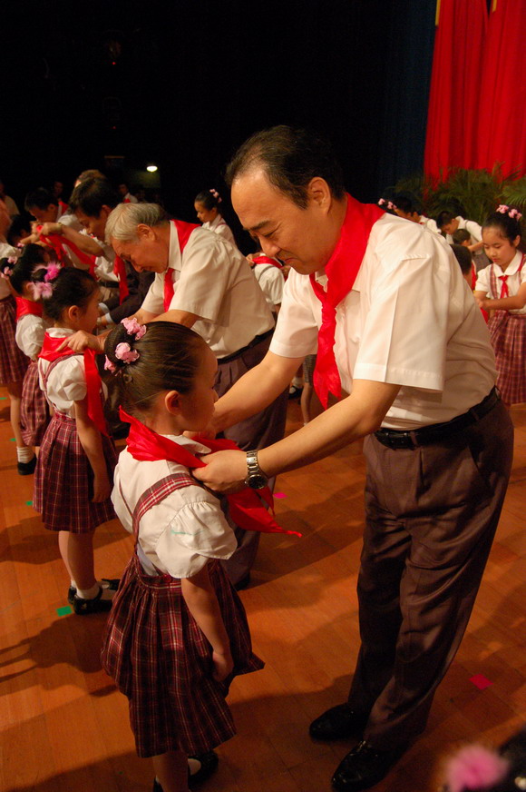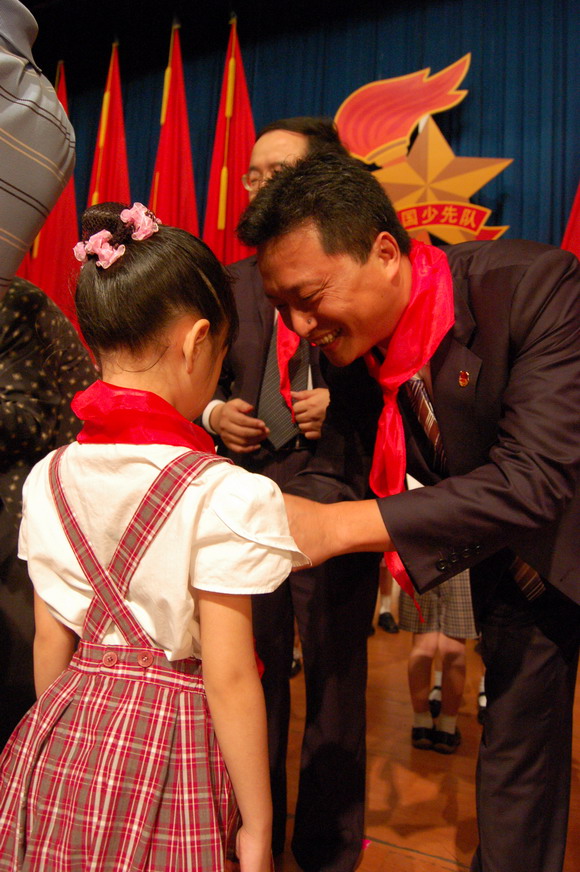 市委副书记白天为新入队的少先队员佩戴红领巾