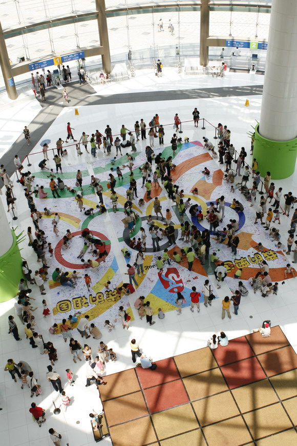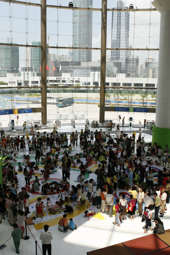 昨天,在市少年宫一楼水晶石大厅,主办单位共组织了深港两地共100多名青少年进行现场创作巨幅宣传画,现场吸引了过千名小朋友们积极参与。我们在现场看到,巨幅宣传画的中心背景是奥运五环标志,象征着2008北京奥运会将以富于东方韵味的团结、公正、和平、友好、进步五大特色面貌面向国际、面向世界。画面将平均分成三个条幅,等距铺展在水晶石大厅中央,便于绘画者现场创作。