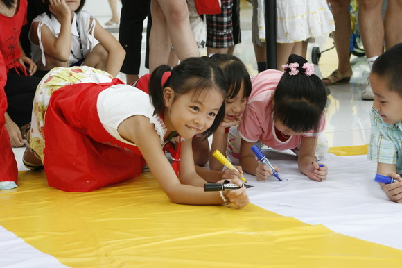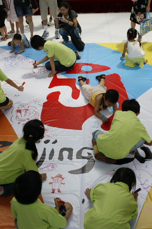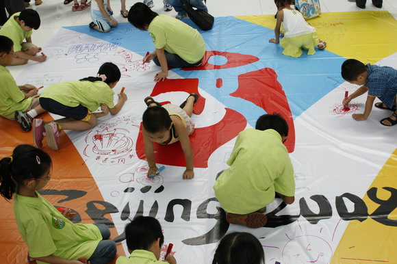 现场人头攒动,气氛异常热烈,创作者们拿着画笔聚精会神地在画幅上描绘心中的回归情结,挥洒着想像里的奥运情景,有的画火炬、有的画运动员、有的画奥运福娃,有的画香港的维多利亚港口,一个个都画得不亦乐乎。许多孩子们画完以后还在旁边大大地写上自己的名字,“要让所有人都看见我对祖国的祝福,更希望北京奥运会快点到来!”一位小朋友一边满意地看着自己的创作部分一边大声说道。画布上的内容丰富有趣、童稚可人,这些画面承载了上千名青少年的祝福和愿望。几个小时的活动始终洋溢着孩子和家长的欢声笑语,一直到活动结束,小创作者们还依然情绪高涨。