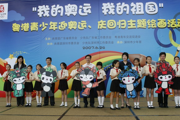 由共青团广东省委、广东省少工委、粤港青年交流促进会主办,共青团深圳市委、深圳市少工委协办,深圳市少年宫承办的“我的奥运、我的祖国”粤港青少年迎奥运、庆回归主题绘画活动,于6月24日(星期日)上午10:00在少年宫隆重举行。团省委、团市委和粤港青年交流促进会的有关领导出席活动。