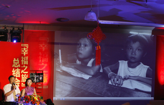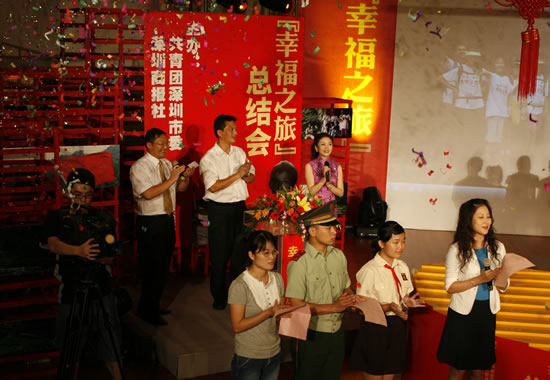 总结会在少年宫合唱团甜美的《同一首歌》中拉开序幕,然后通过对当地村民代表、参加“幸福之旅”的母亲和女儿等嘉宾的访谈,向观众们再现了“幸福之旅”中的点点滴滴,场面感人。在采访湘西来深青工家庭时,主办方特意从家乡请来了他的老人和女儿来到现场,当小女孩抱住三年未见的爸爸大哭起来时,在场的人都忍不住留下热泪。一位家长说,总结会让他和孩子都感受到“幸福之旅”中的感动,感受到人与人之间的爱和关怀,感受到奉献爱心的幸福。