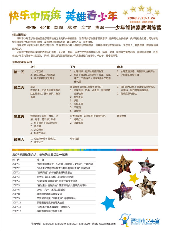 少年宫有关负责人说,少年宫领袖团自成立以来,受到广大学生、家长和老师的关注,开展的训练和活动深受欢迎。孩子们在团队受到的心理和拓展训练使他们进步明显,综合素质和领导能力大大提高,其进步和成长在学校和家庭都有明显体现。团队受到家长和教育工作者的认同,尤其是今年暑假前往香港和童军交流,活动取得极好效果,很多家长和老师都希望能给更多的孩子参与机会,希望更多的孩子能参与这种提高综合素质的活动,补充学校和家庭的不足。因此,在与有关方面,尤其是和香港童军协商之后,少年宫决定从今年寒假开始推出“少年领袖素质训练营”。除各校推荐学生干部参加外,还向全市公开招募,让更多的孩子体验领袖训练营的生活。不过,因为训练和各种安排的限制,为了保证效果,这次只能招募90个团员。以后少年宫将会不定期举办此类活动,给更多孩子锻炼的机会,也给领袖团提供更多的后备力量。