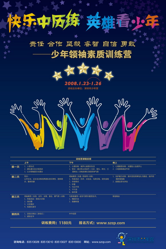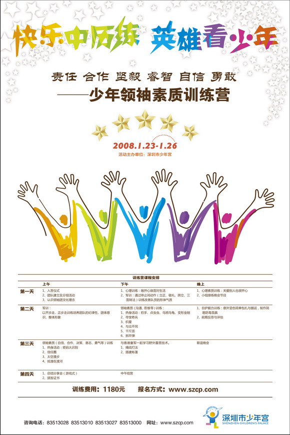 今年寒假,少年宫将与香港童军再次联手,打造“少年领袖素质训练营”。这是少年宫继暑假组织领袖团前往香港与童军交流活动、十一月份前往香港参加童军大会操观摩活动之后第三次与香港童军总会联合举办活动,目的是加强深港两地少年的学习和交流,同时,把童军的一些理念和训练方法和国内教育方式结合起来,给深圳的青少年更多综合训练的机会。