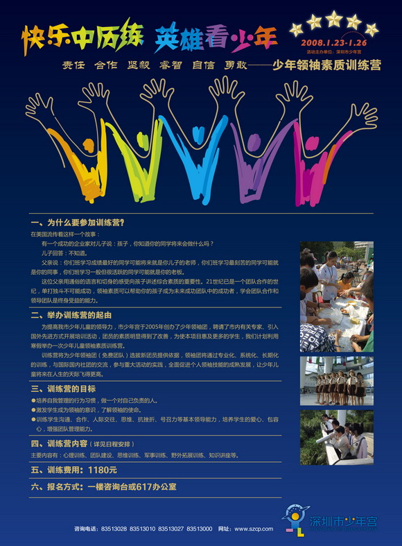 笔者在少年宫咨询台采访到,训练营的消息在少年宫发布以来,倍受关注,很多家长和学生前来咨询和报名。有关详情可登陆少年宫网站www.szcp.com,咨询电话83513028,83513010,83513027。
