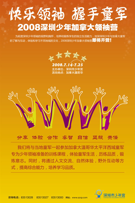 为拓宽深圳少年领袖的视野和胸怀,培养和锻炼学生的独立生活能力,加深深圳少年与加拿大童军的了解与互动,体验和学习不同地域的文化,2008深圳少年加拿大领袖营即将开营!