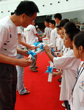 周日的少年宫热闹欢乐,下午,领袖素质训练营的营员们从训练基地回到少年宫,兴高采烈地和他们的爸爸妈妈在大厅做了亲子活动,并举办闭营仪式。