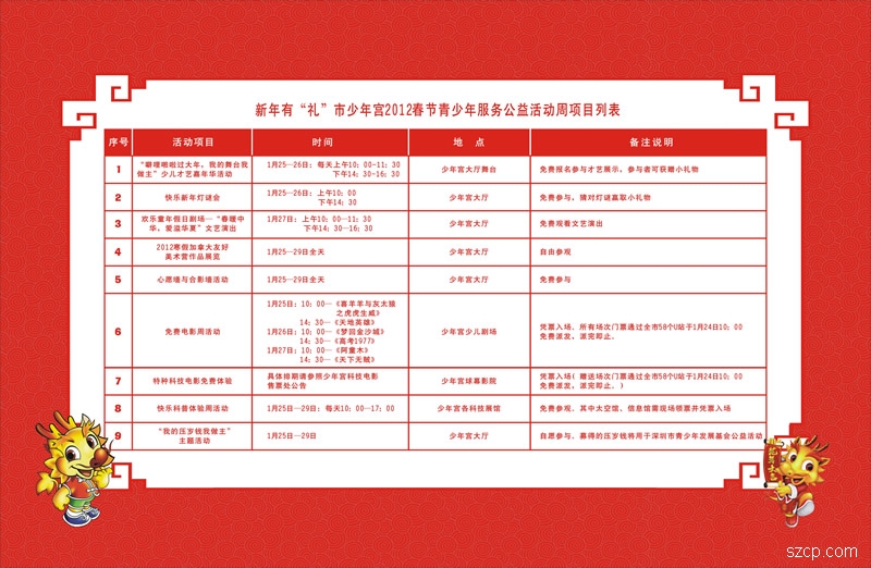 2012年新春之际,深圳市少年宫将继续举办“新年有‘礼’——市少年宫2012春节青少年服务公益活动周”活动。