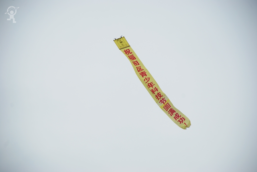 空中的条幅上写着“祝福田区青少年科技节圆满成功!”