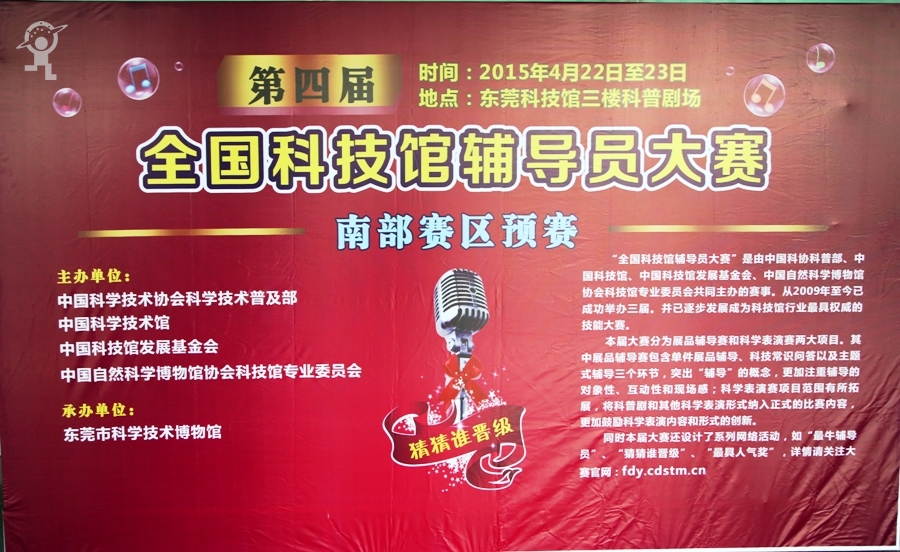 4月22日-23日," 第四届全国科技馆辅导员大赛" 南部赛区预赛在东莞科技馆举行。来自江西、河南、湖北、湖南、广东、广西、海南六省一区的18个场馆、80多名参赛选手以及100多名观摩人员齐聚一堂。