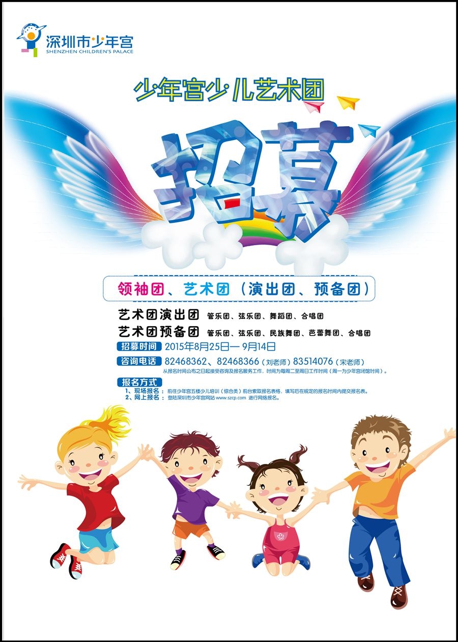 一年一度的深圳市少年宫艺术团和领袖团的秋季团员招募工作已于8月25日正式启动,报名时间为8月25日——9月14日。少年宫团队致力培养和挖掘全市高素质、高水平、有特长的少儿艺术人才,为他们提供一个展示艺术才华的舞台,凡有艺术特长或领袖才能的中小学生,均可登录少年宫网站www.szcp.com或前往少年宫现场报名,凡入选成为艺术团演出团和领袖团团员者,一律免费参加、排练和演出,并有机会代表深圳市参加国内外的演出、交流及重大比赛活动。