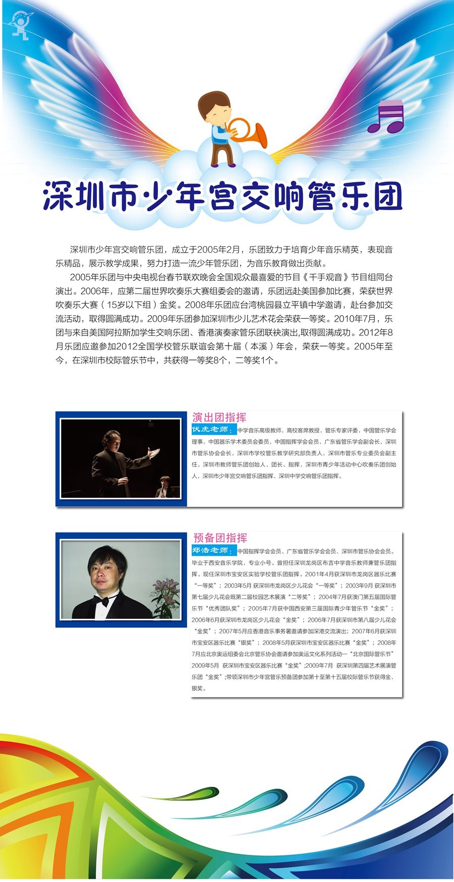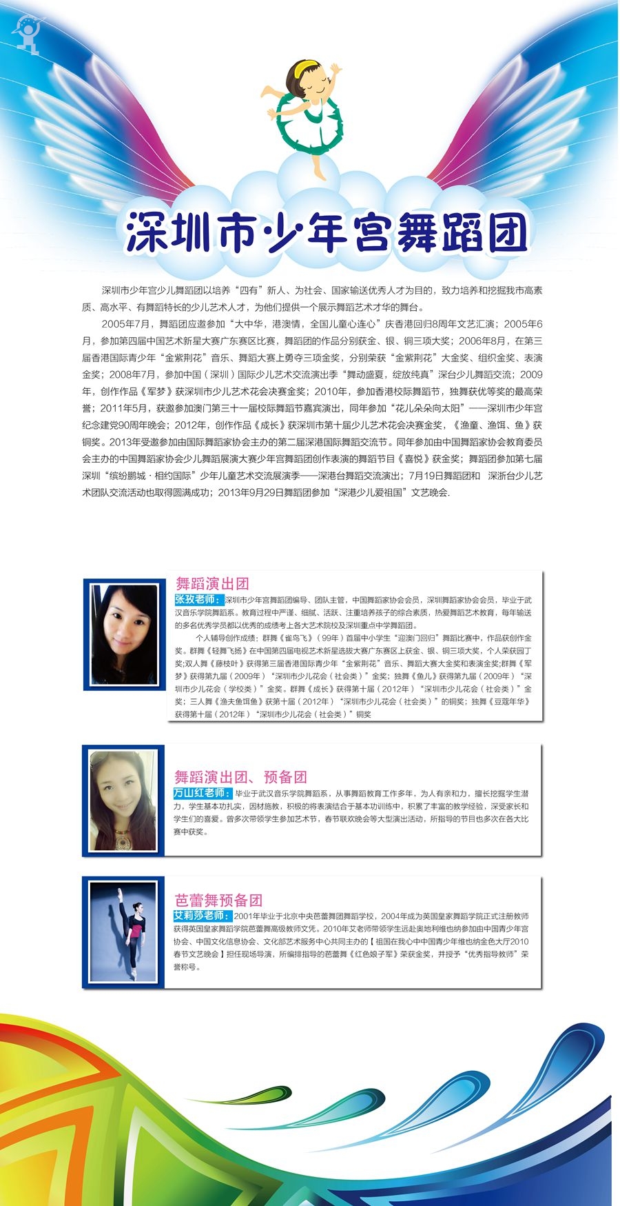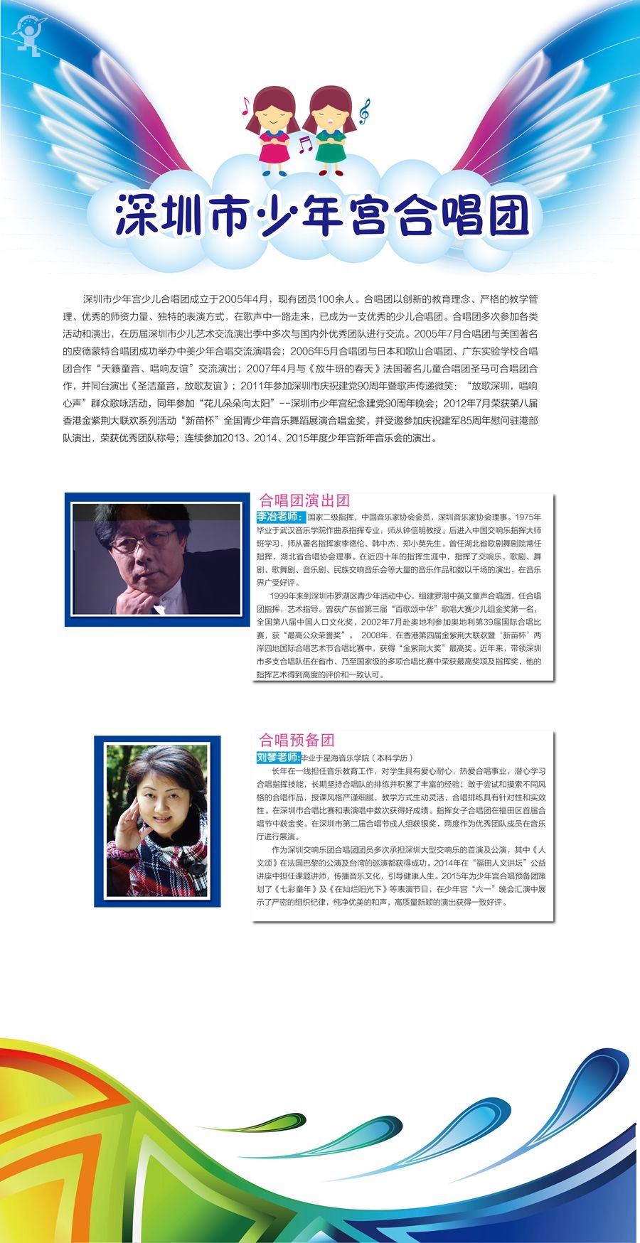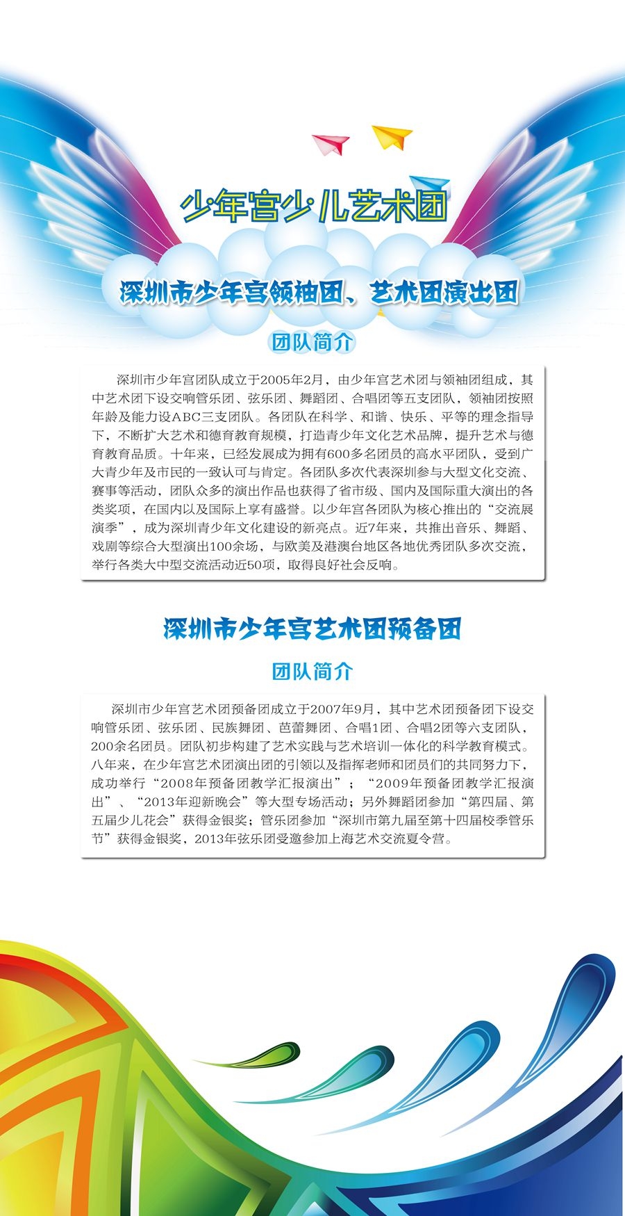 市少年宫艺术团成立于2005年2月,十年来,已发展成为一支高素质高水平的艺术团队,成为培养各类少儿艺术人才的摇篮,长期以来,倍受业界和社会关注。少年宫艺术团不仅拥有先进的教育理念,一流的活动设施,还聘请了一级的导师和指挥,吸收了深圳最优秀的少儿艺术人才,为孩子们提供广阔的艺术展示平台。