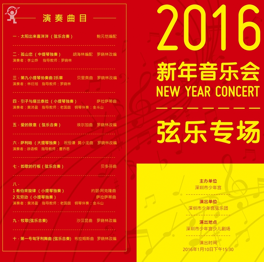 历年的新年伊始,深圳市少年宫均会举办新年音乐会以迎接和庆祝新年,为全市小朋友送去新年的祝福。值2016新年来临,市少年宫将于1月10日(周日)下午在少年宫少儿剧场举办“深圳市少年宫2016新年音乐会弦乐专场”。本次音乐会由市少年宫弦乐团担任主要演奏,同时也特别邀请到多次获得在香港举办的国际音乐类比赛小提琴演奏金奖的黄沛盈小朋友担任小提琴独奏。他们将共同为观众送上十多支中外经典曲目的演奏。