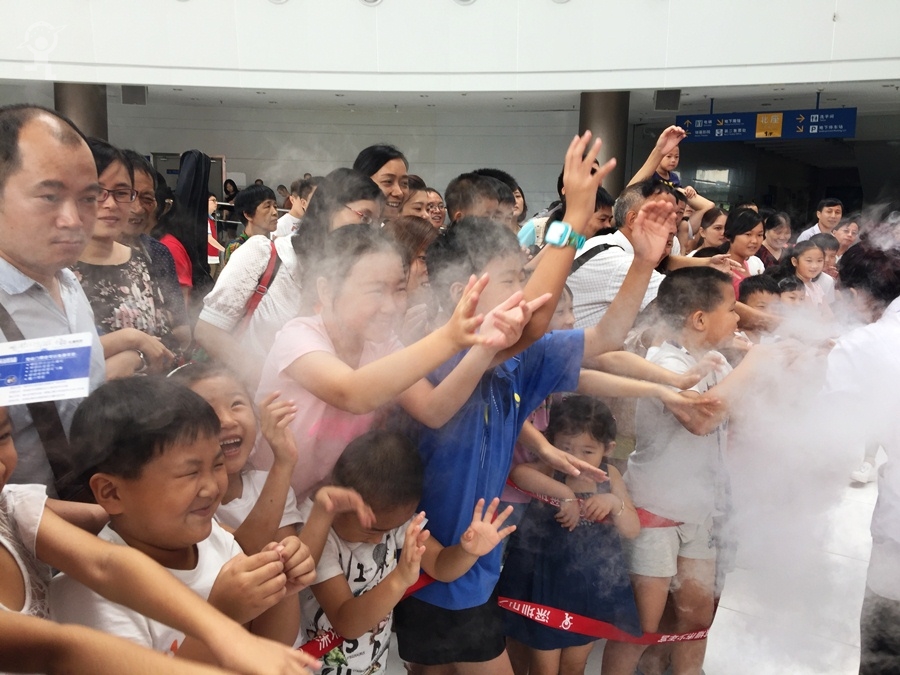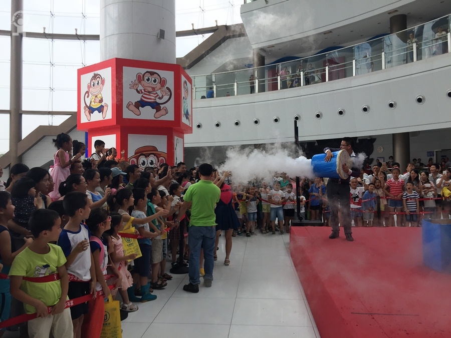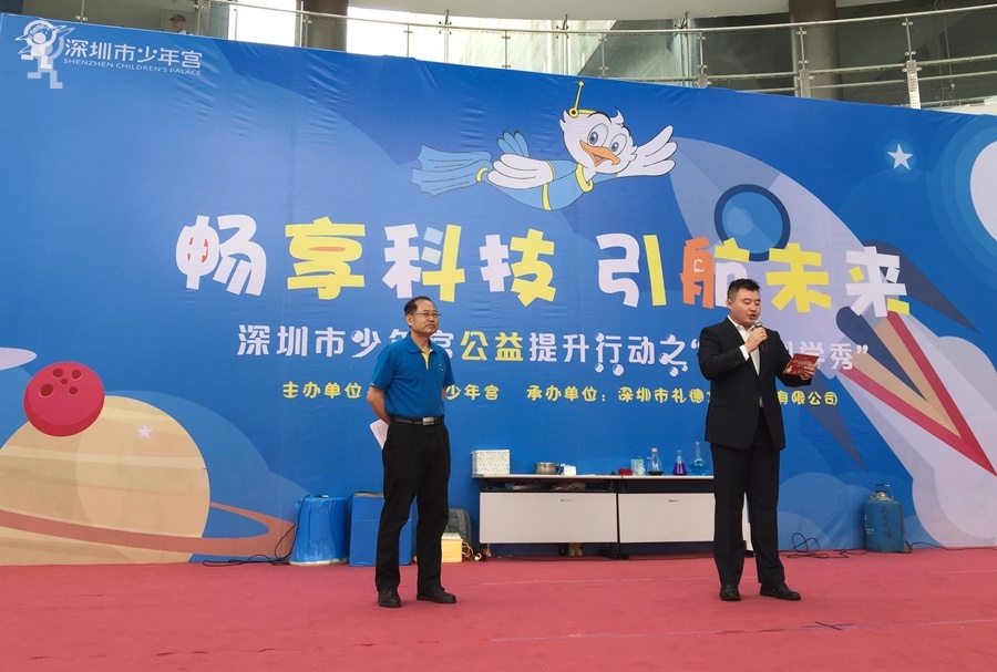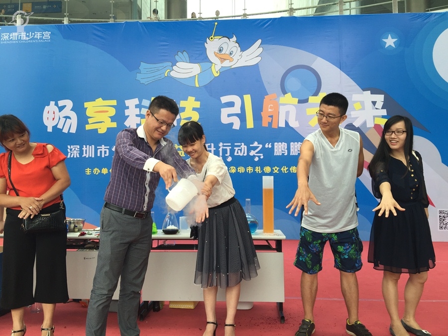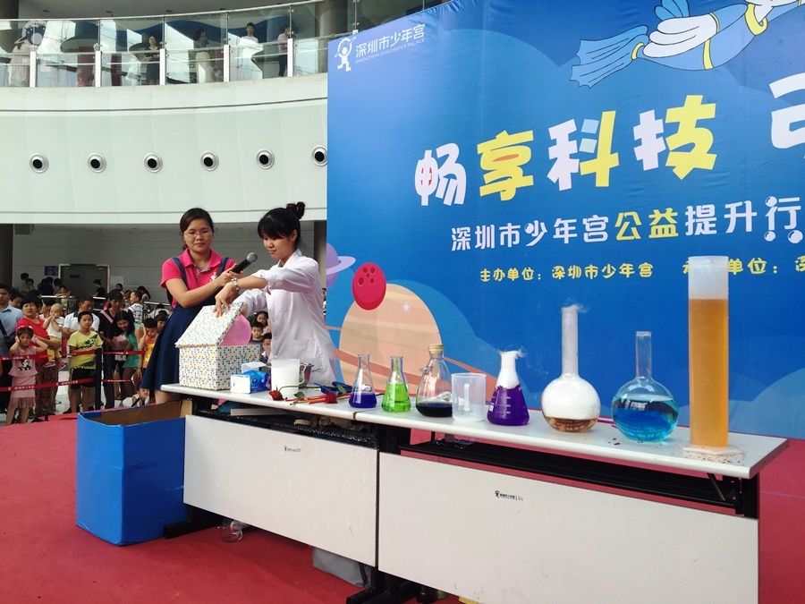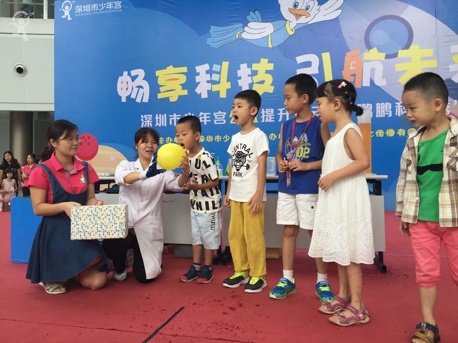 7月10日上午,少年宫大厅一场简短温馨的门票赠送仪式在舞台上进行。随着一张写有1800张公益门票字样的门票板被转交至团市委工作人员手中,“深圳市少年宫公益提升行动”宣告正式启动了。随后,作为“公益提升行动”之一的“鹏鹏科学秀”首秀也隆重登场,本次“鹏鹏科学秀”的主题为“畅享科技,引航未来”。现场老师利用气球、食品、玻璃杯等各种道具,将平常只能在实验室看到和实现的科学现象,以生动有趣的方法向家长和孩子们一一展现。家长和孩子们近距离地领略了一把科学的神奇妙趣。
