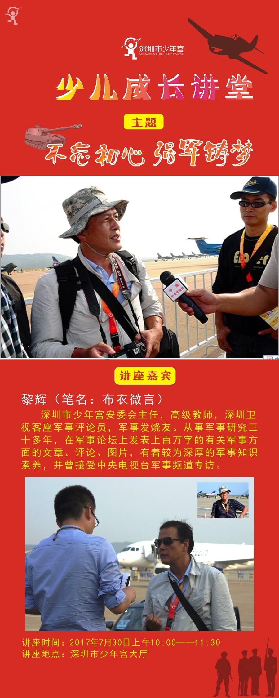由少年宫主办的“少儿成长讲堂”第58期活动将在7月30日(周日)举办主题为“不忘初心·强军铸梦”公益讲座。邀请知名军事评论员为家长及小朋友们介绍中国人民解放军诞生及发展,展示国家的进步与强盛的国力及军力,培养少年儿童的爱国主义情怀。