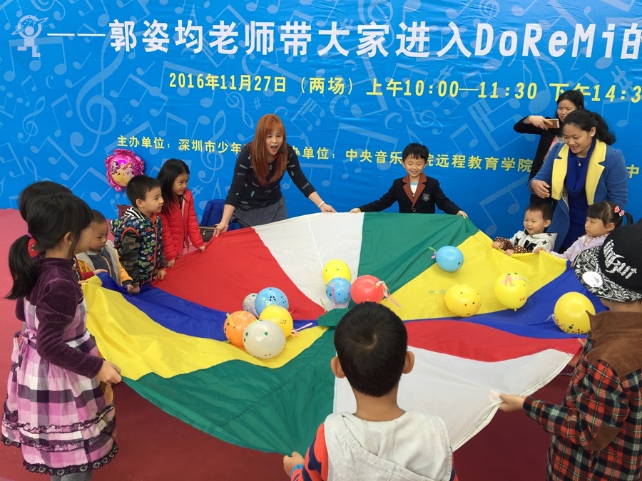 去年11月,深圳市少年宫“少儿成长讲堂”曾邀请到台湾师范大学音乐教育博士郭姿均老师来到少年宫举办了两场《大手拉小手打开音乐宝盒》的音乐互动讲座。讲座全程年近50的郭老师始终活泼热情、激情四射,在她的带领下,家长与孩子们通过各种不同的音乐游戏,一起领略和体会音乐学习的趣味,现场气氛特别欢快热烈,给在场所有家长和孩子留下了深刻印象。