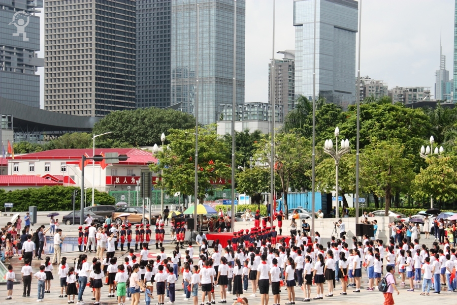 迎着朝阳,来自福田区教科院第二附属小学的升旗队伍护送国旗来到国旗旗杆前,在将国旗抛向天空的瞬间,广场上近千名群众肃穆地抬起头,全神贯注地凝视着国旗行注目礼,口中大声齐唱雄壮激昂的国歌,在一片爱国热情澎湃的气氛中,五星红旗缓缓升起,在蓝天白云下迎风飘扬。