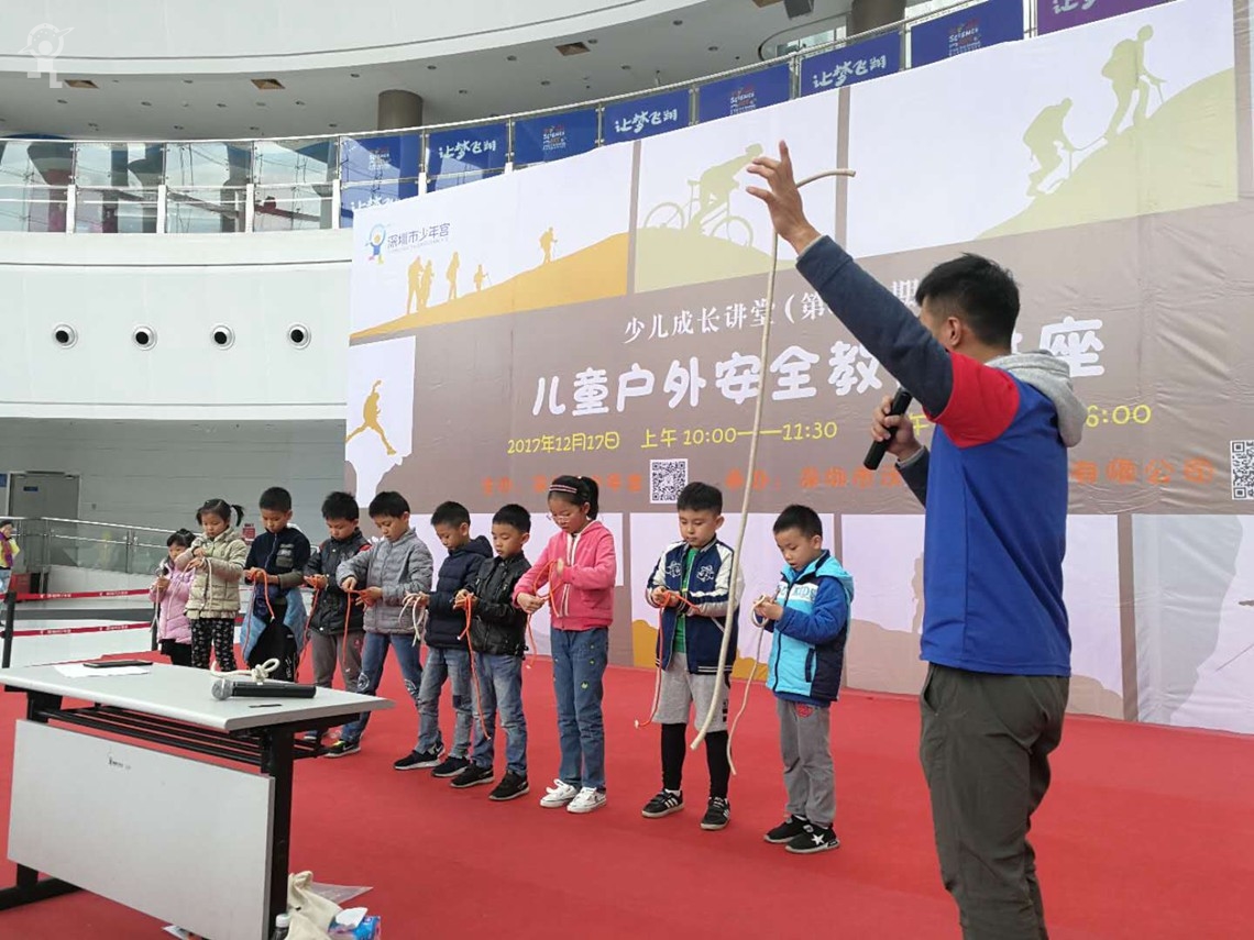 此次讲座的主讲嘉宾是前东南战区百人突击队队员、具有五年特种兵军旅生涯的谭教官。谭教官退役后一直从事青少年户外拓展、户外急救和户外生存的课程活动,他在现场图文并茂地讲解攀岩、溜索、露营、探洞等有趣的户外活动项目,并教给孩子们一些实用的野外求生技能,如野外失血的处理、一根绳子的循环使用、野外生火等。谭教官在现场展示了一些在野外生火的工具,并演示了如何利用“镁棒”进行摩擦生火,孩子们都兴致盎然,跃跃欲试,在互动环节邀请了几组小朋友上台亲自实践,孩子们玩得特别开心,并在挑战成功后和大家分享了心得体会。“当在野外遇到危险,你如何用一根绳子进行救援?”在教官的提问之后,孩子们在台下都积极踊跃地举手,争先恐后地回答。谭教官将绳子发到孩子们手上,在现场手把手地教孩子们如何打坚实的绳结进行自救,并进行了“打绳结”比赛,胜出的孩子还获得了小礼品。孩子们在这种饶有趣味的活动中学到了户外生存的本领,受益匪浅。