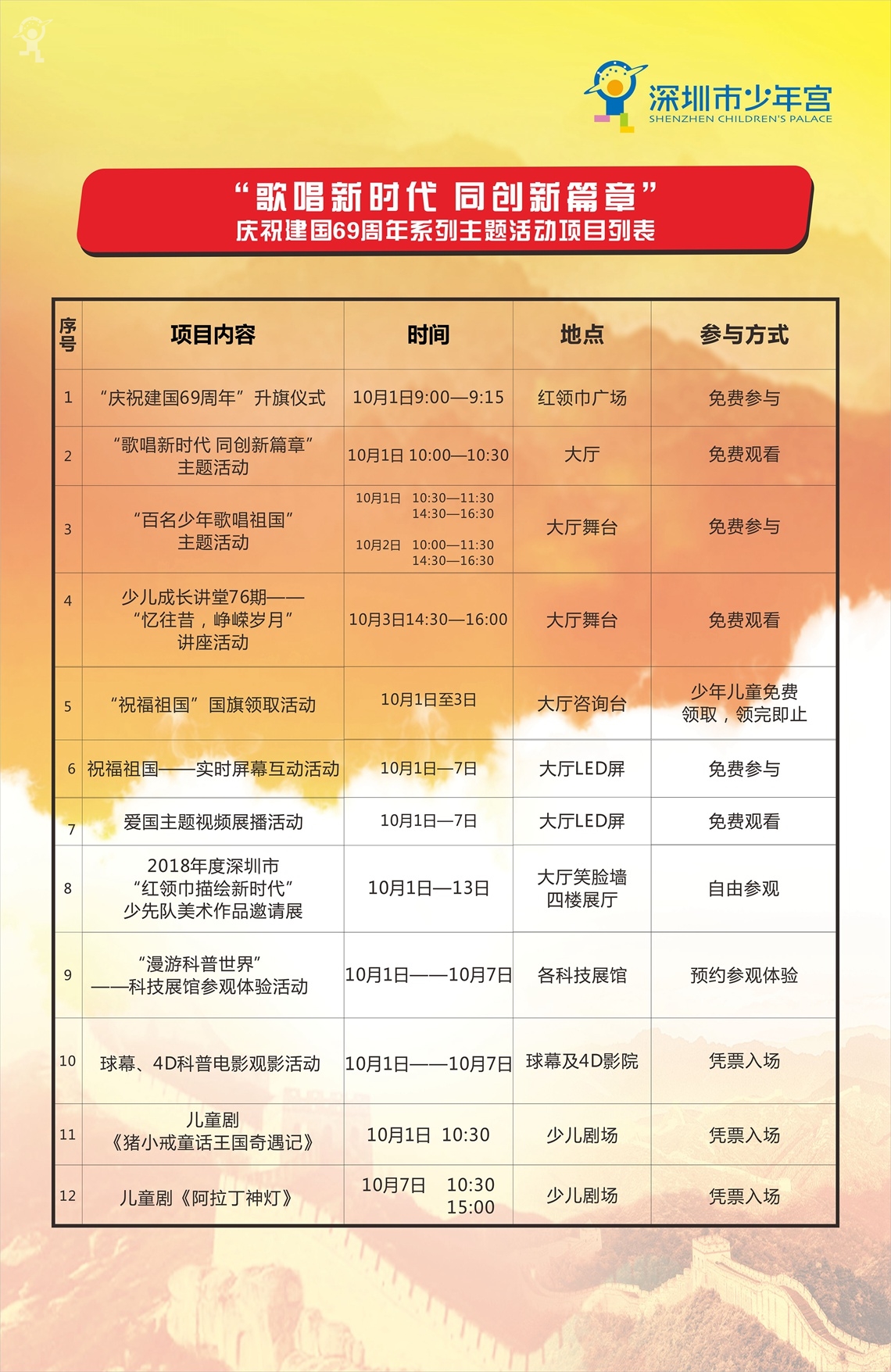 歌唱新时代 同创新篇章 深圳市少年宫将举办庆祝建国69周年系列主题活动