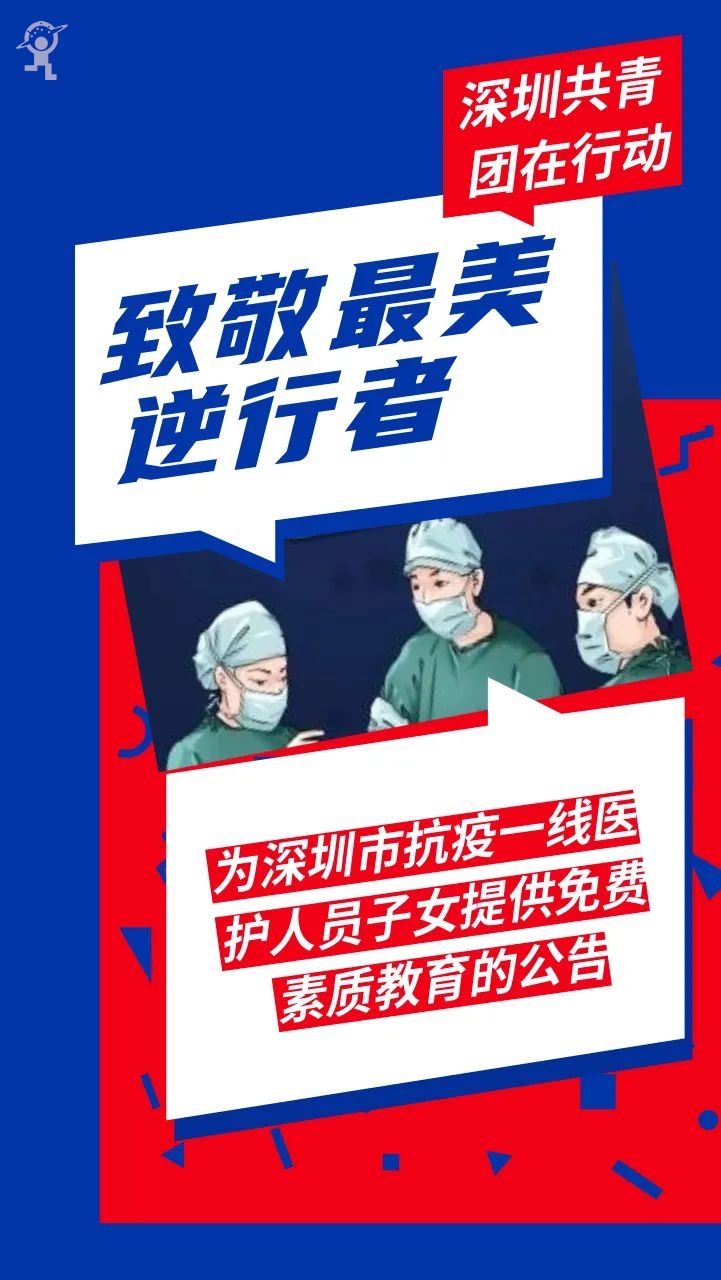 新冠肺炎疫情发生以来,全市广大医务人员不惧个人安危,无私奉献、英勇奋战,充分体现了敬佑生命、救死扶伤、甘于奉献、大爱无疆的医者情怀,是这场战役中的“最美逆行者”!为关心关爱我市疫情防控一线医务人员及其子女,共青团深圳市委员会组织下属市少年宫、市青少年活动中心两个青少年活动阵地,为我市援鄂医疗队员、新冠肺炎定点收治医院等卫生系统参加一线防控救治的医务人员子女,提供免费校外素质教育培训课程,具体如下: