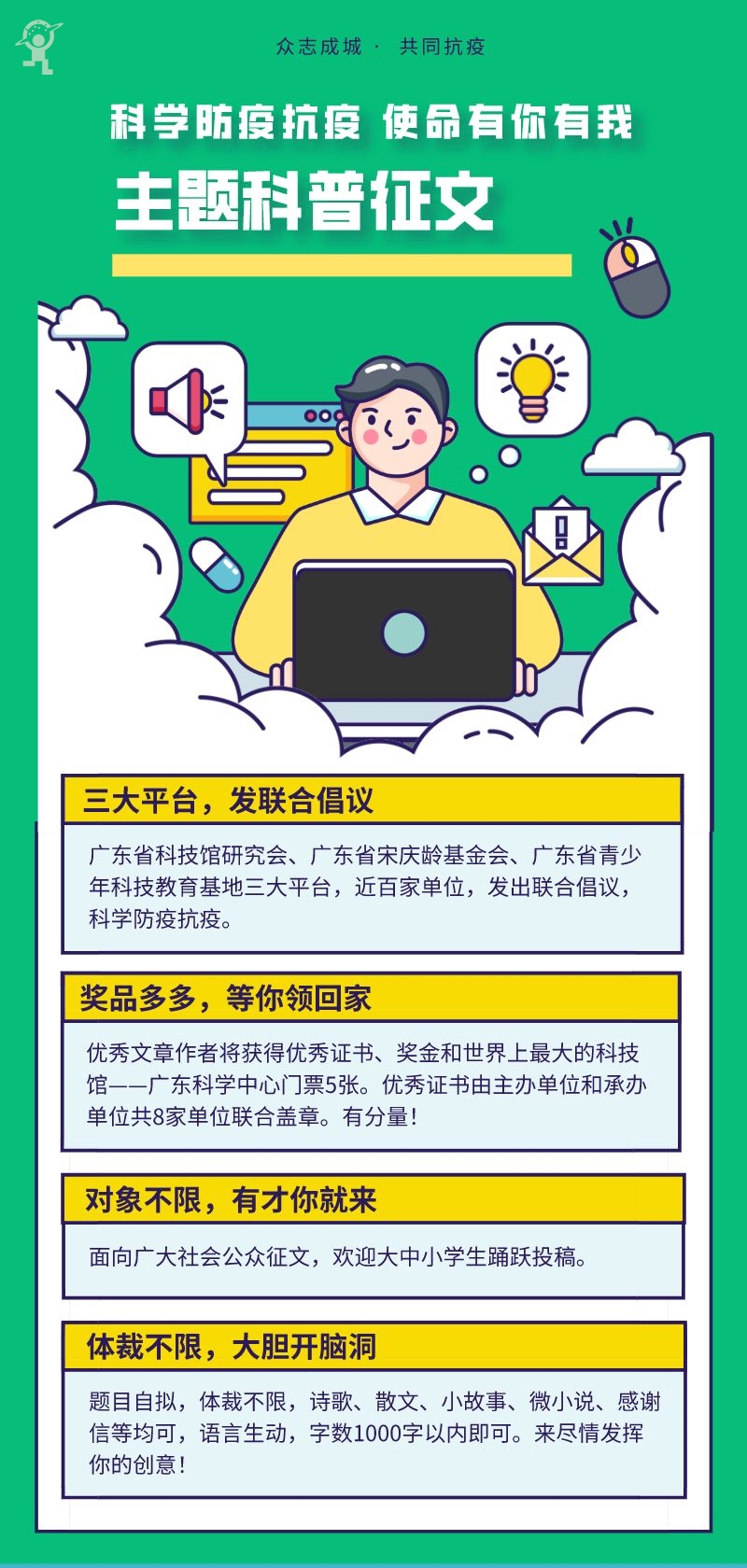 ·请在邮件主题或文章标题前注明“科学防疫抗疫使命有你有我”征文活动。来稿需注明姓名、年龄、单位或学校、联系方式(含联系人、手机、邮箱)。