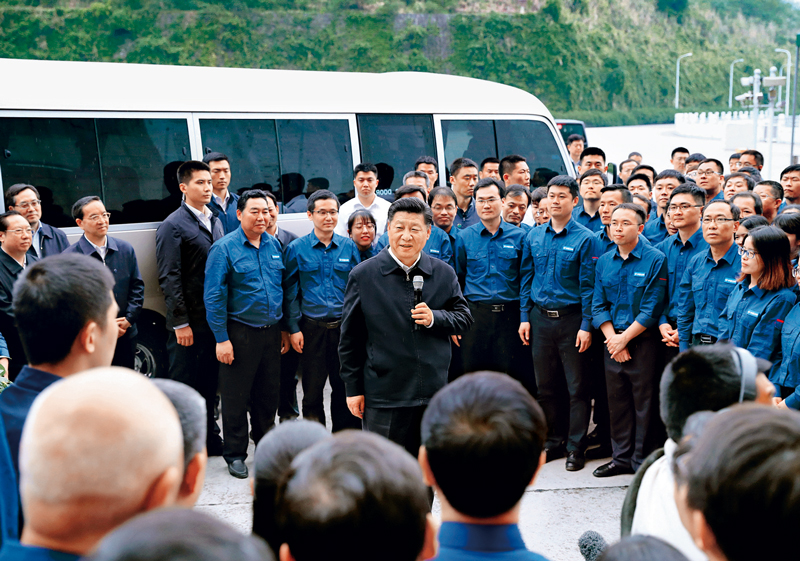 2018年4月26日下午,中共中央总书记、国家主席、中央军委主席习近平在武汉主持召开深入推动长江经济带发展座谈会并发表重要讲话。这是座谈会前,习近平于24日下午在三峡大坝左岸电站考察。 新华社记者 谢环驰/摄