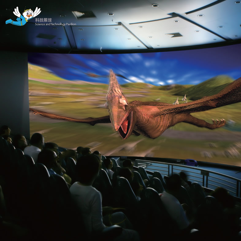 环幕4D动感影院系统设在水晶石大厅空中的椭圆体结构内,采用新科技多媒体手法去完成科普教育的功能。4D影院是从传统的立体影院基础上发展而来,相比较于其他类型影院,具有主题突出、科技含量高、效果逼真、画面冲击性强等特点和优势。